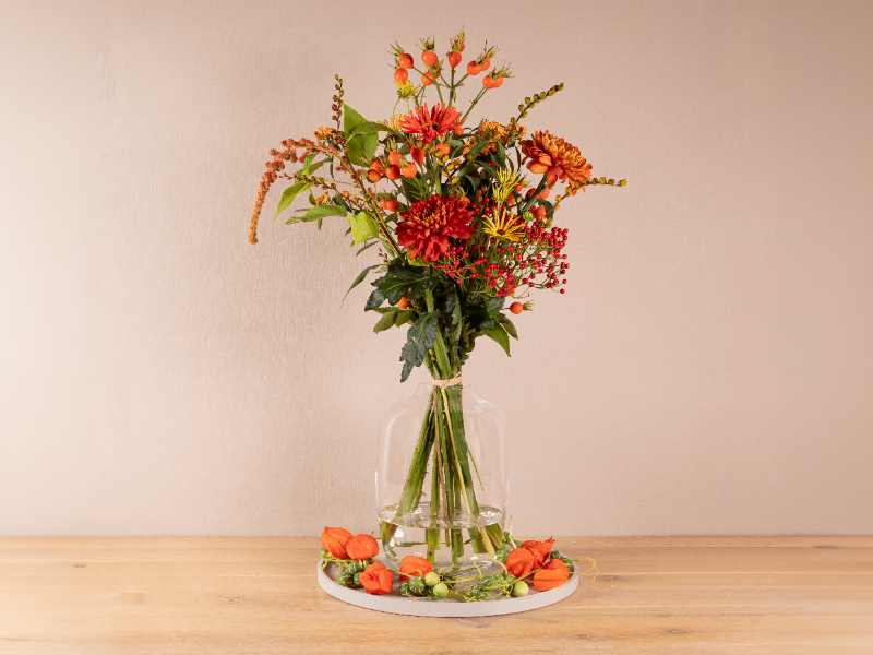 Wild en luchtig boeket in warme herfsttinten, met bessen en speelse opbouw.